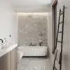 Płytki wielkoformatowe – ich większa powierzchnia ograniczy liczbę fug, dzięki czemu ściany i podłogi będą wydawały się bardziej jednolite i harmonijne.