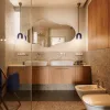 Wiszące meble łazienkowe — szafki pod umywalkę i półki na kosmetyki montowane na ścianie, odsłaniające posadzkę i sprawiające, że wnętrze wydaje się bardziej otwarte.