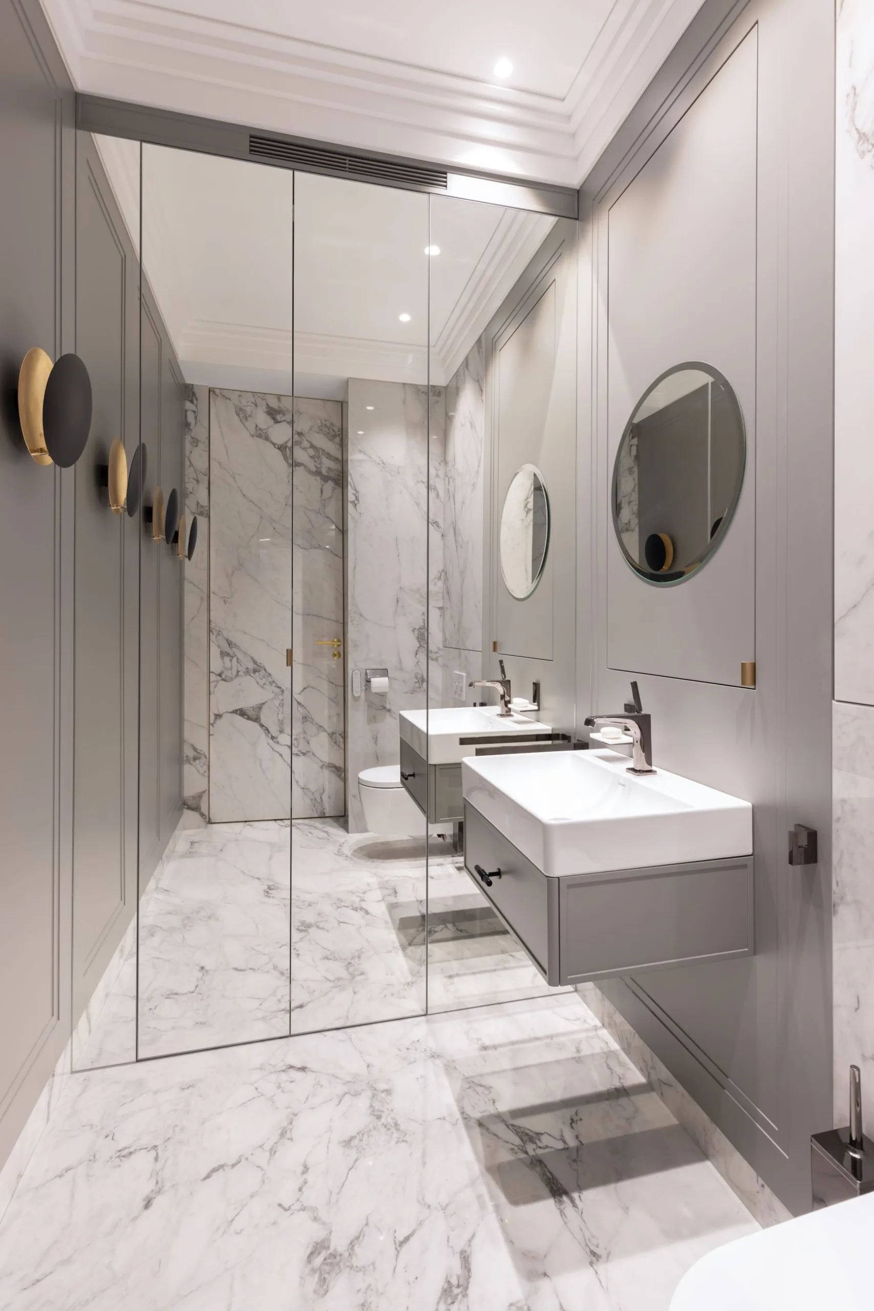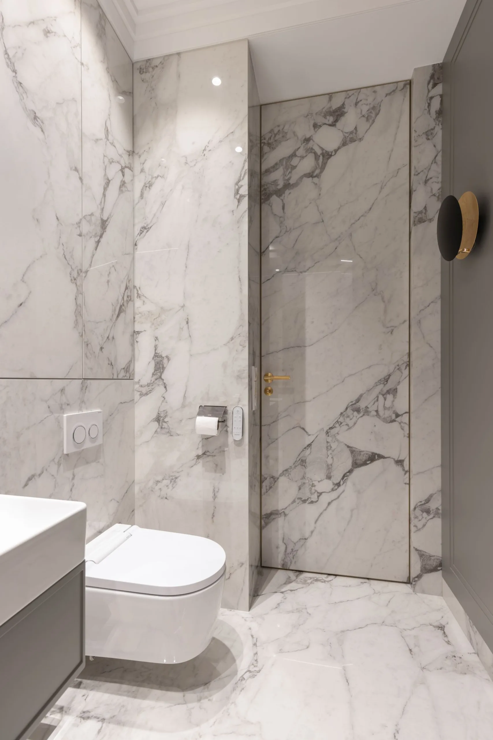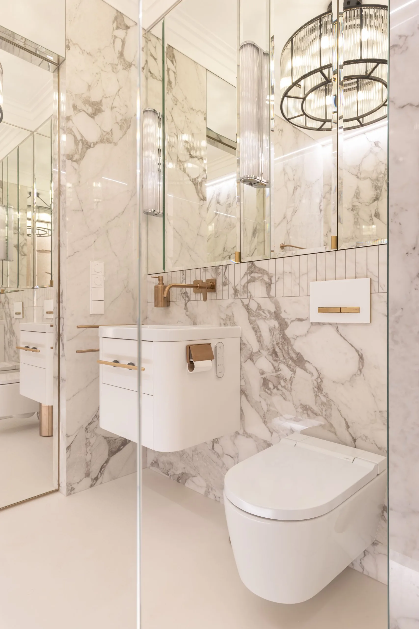 Wykończenie wnętrza opiera się na ponadczasowej elegancji marmuru, który w połączeniu z jasną bazą i lustrzanymi płaszczyznami buduje wrażenie szlachetności i ładu. Ciepłe akcenty złota wprowadzają zaś nutę luksusu i wyrafinowania. Istotną rolę odgrywa tu armatura, dobrana z dużą świadomością zarówno estetyczną, jak i funkcjonalną. Przy umywalce zastosowano baterię AXOR Citterio M – kolekcję o miękkiej, architektonicznej linii, która łączy nowoczesną formę z ponadczasową elegancją.