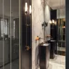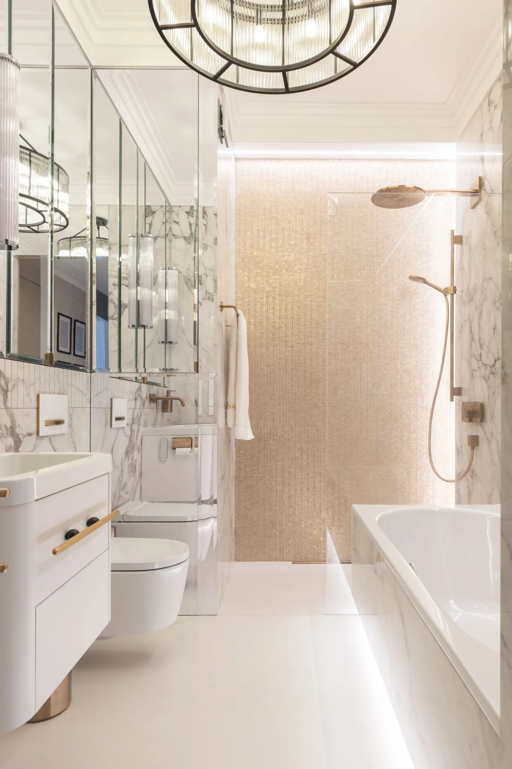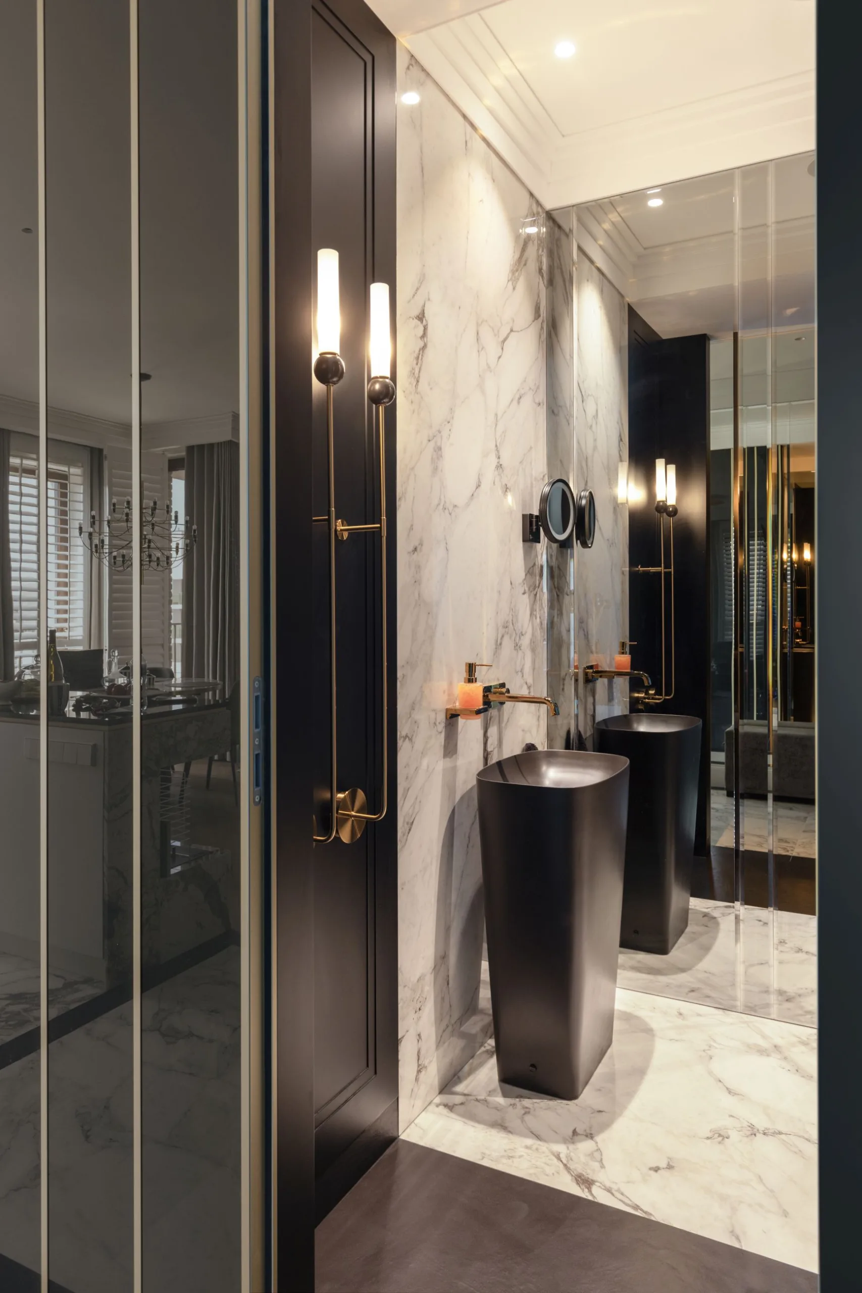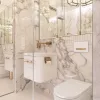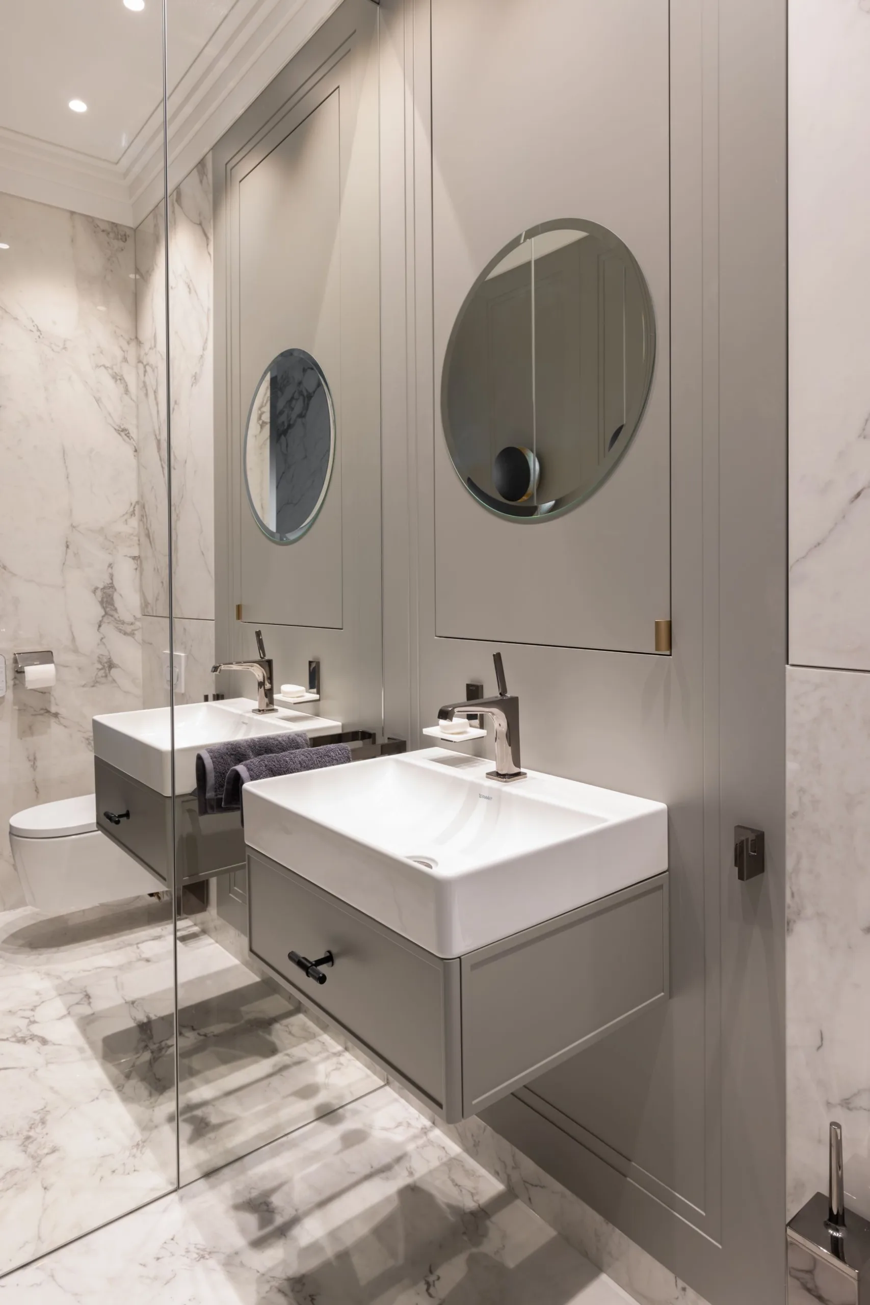 Wykończenie wnętrza opiera się na ponadczasowej elegancji marmuru, który w połączeniu z jasną bazą i lustrzanymi płaszczyznami buduje wrażenie szlachetności i ładu. Ciepłe akcenty złota wprowadzają zaś nutę luksusu i wyrafinowania. Istotną rolę odgrywa tu armatura, dobrana z dużą świadomością zarówno estetyczną, jak i funkcjonalną. Przy umywalce zastosowano baterię AXOR Citterio M – kolekcję o miękkiej, architektonicznej linii, która łączy nowoczesną formę z ponadczasową elegancją.