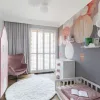 Po lewej stronie od wejścia do mieszkania Anna Wilniewczyc zaplanowała strefę prywatną, do której prowadzą drzwi ukryte pod tapetą, niewidoczne na pierwszy rzut oka. Składają się na nią sypialnia, pokój dziecka i łazienka master. Stylistyczny charakter tej części domu pozostał spójny ze strefą dzienną. Dominuje tu ta sama paleta barw, białe meble w zabudowie oraz tkaninowe tapety, które nie tylko dodają elegancji, ale jednocześnie wyciszają wnętrze swoją delikatną fakturą.
