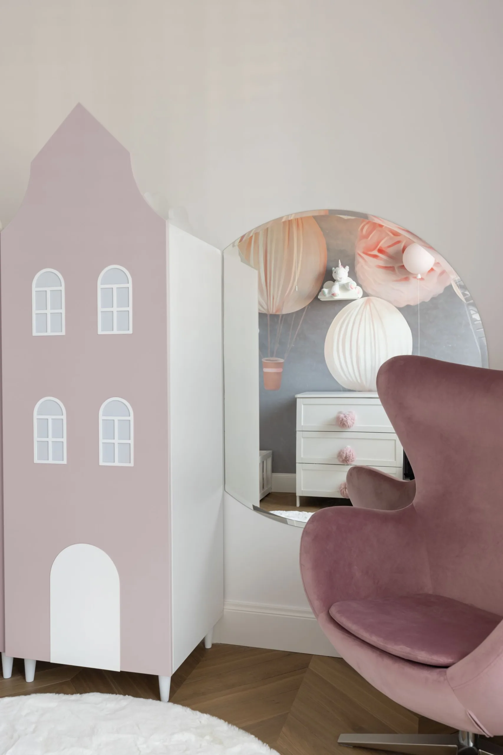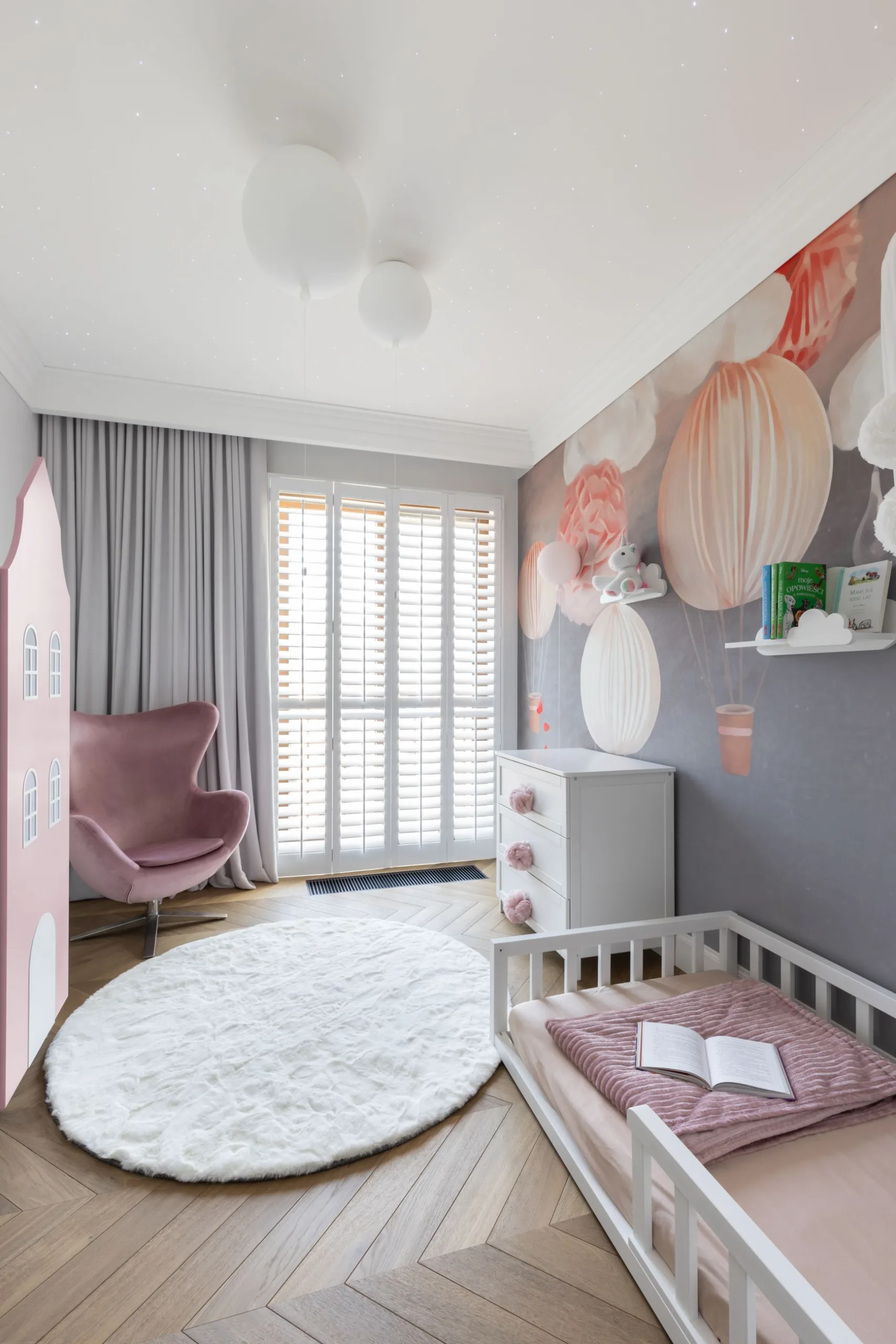 W wydzielonym korytarzu w tej części apartamentu architektka zaprojektowała duże, funkcjonalne szafy. W sypialni przeważają miękkie materiały tapicerowanego łóżka, zagłówka oraz pufy wykonanych na zamówienie pod projekt architektki. Wykorzystano tu także – podobnie jak w salonie – rozwiązanie ukrywające telewizor. Przeważająca w projekcie paleta barw w przypadku pokoju małej dziewczynki przełamana została akcentami w odcieniu pudrowego różu. Nie zabrakło tu właściwych dla królestwa małej księżniczki akcentów – bajkowej tapety, regałów w formie małych kamieniczek czy rozgwieżdżonego nieba wykonanego ze światłowodów.