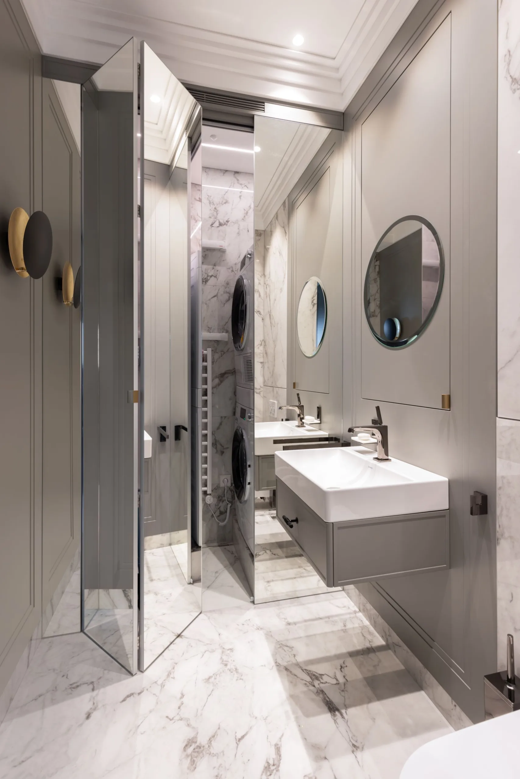 Ważnym elementem tej części apartamentu jest łazienka – pomyślana jako elegancka, dyskretna strefa towarzysząca przestrzeni pracy. Stonowana kolorystyka, klasyczne podziały frontów i wielkoformatowy gres budują spokojne, uporządkowane tło. Przy umywalce pojawia się bateria AXOR Citterio E w wykończeniu czarnego chromu polerowanego – oszczędna w formie, precyzyjna i ponadczasowa. Całość uzupełniają akcesoria AXOR Universal, które subtelnie porządkują codzienne funkcje. Za lustrzaną ścianą, która w rzeczywistości pełni rolę składanych drzwi, znalazła się pralnia. To rozwiązanie pozwoliło ukryć techniczną strefę tam, gdzie nie było na nią miejsca w innych częściach domu, bez zaburzania estetyki wnętrza.