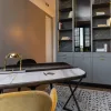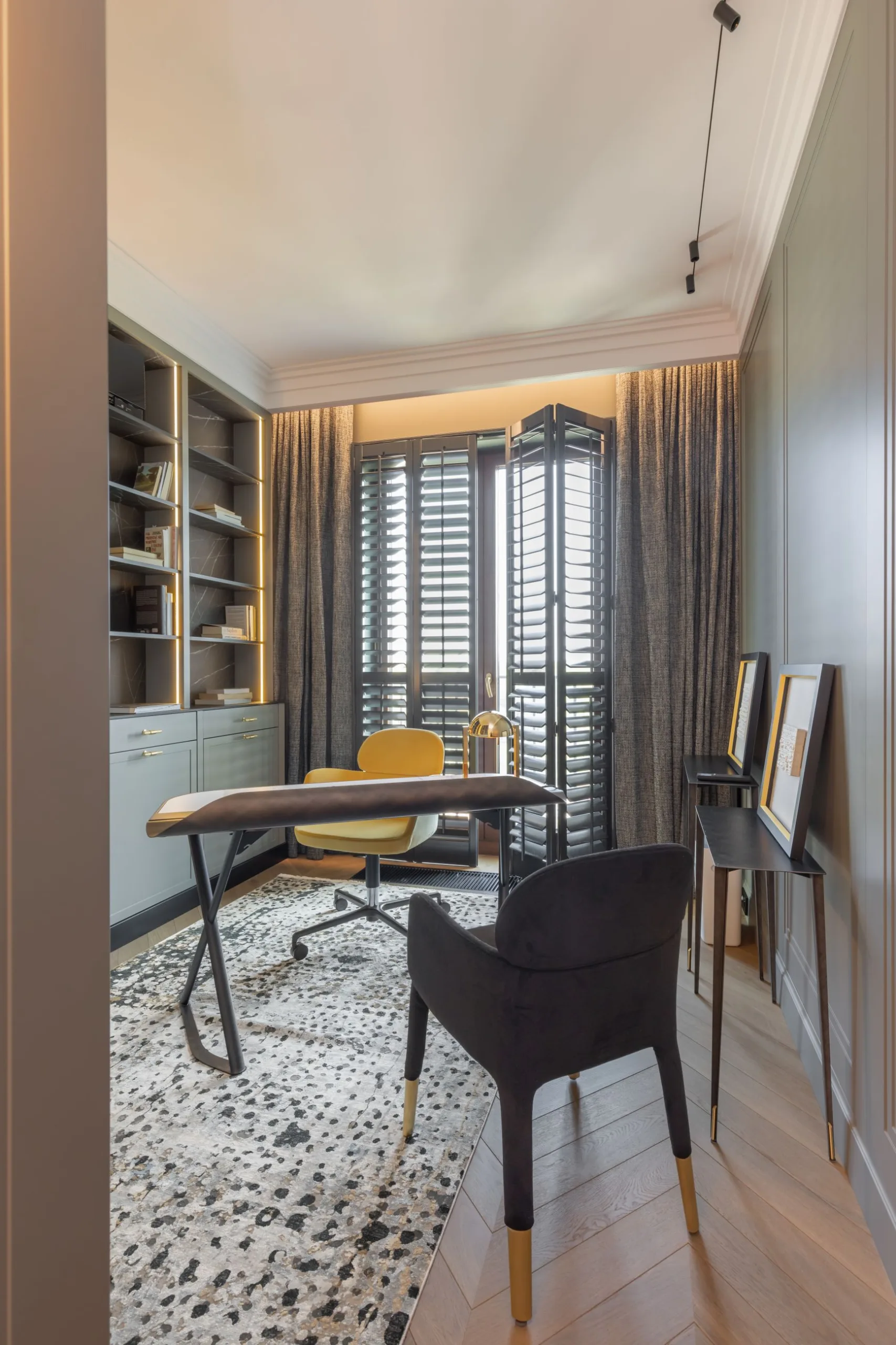 Apartament posiada także strefę pracy, która funkcjonalnie nie ingeruje w przestrzeń prywatną. Drzwi do niej znajdują się w ciemnej zabudowie ze szkła polimerowego po prawej stronie wejścia do apartamentu. Architektka zaprojektowała tu niewielki gabinet oraz łazienkę. Przestrzeń pracy zdominowały bardziej zdecydowane tony szarości, na tle których wyróżnia się żółty fotel gospodarza. Stworzone na wymiar regały z szufladami i częścią przeszkloną pozwalają na swobodne przechowywanie dokumentów i książek, a w witrynie jest miejsce na alkohole.