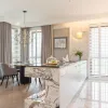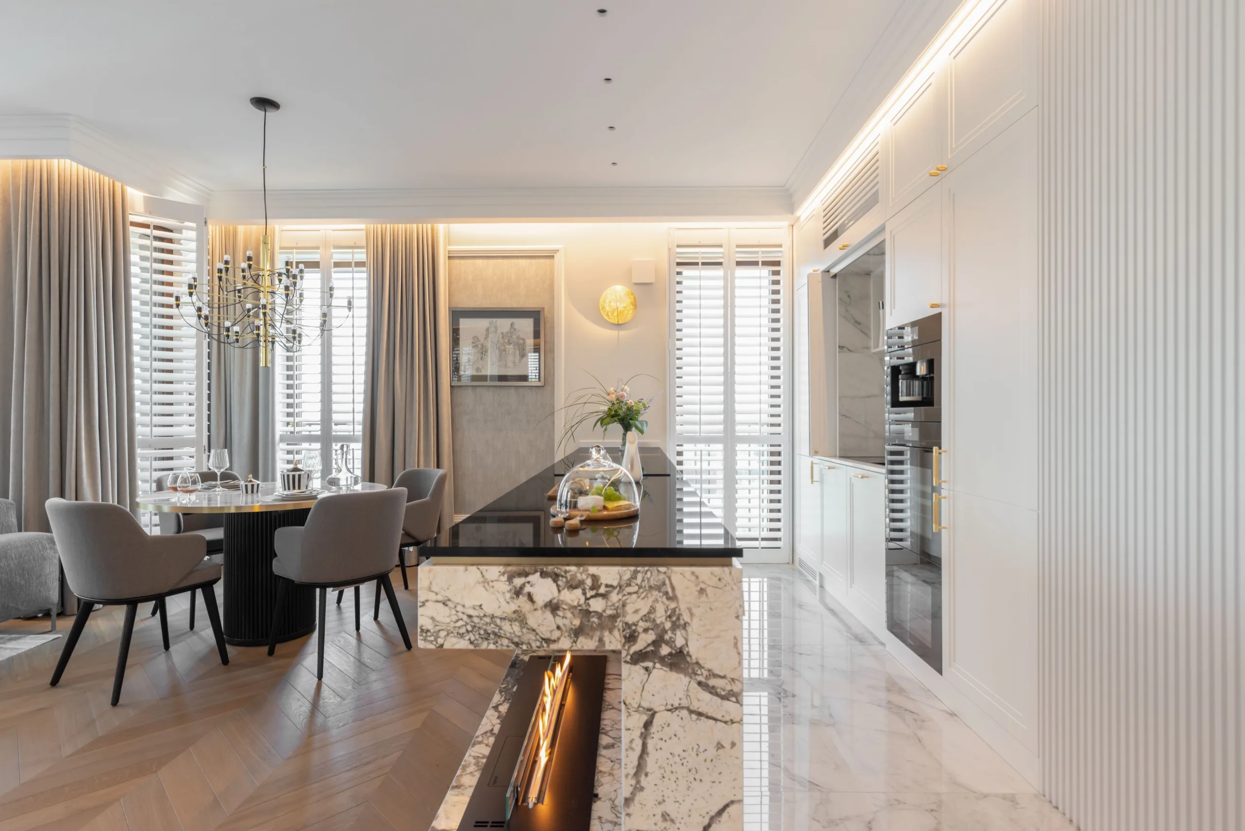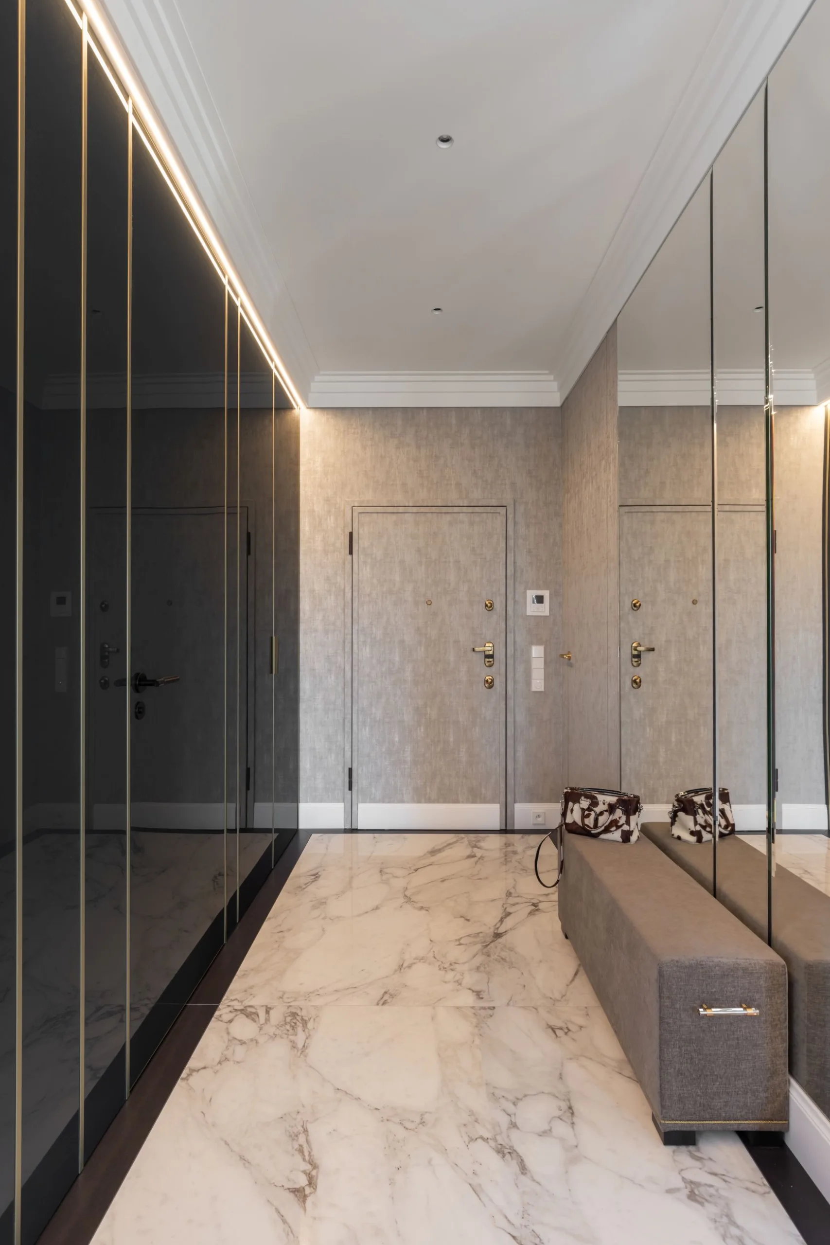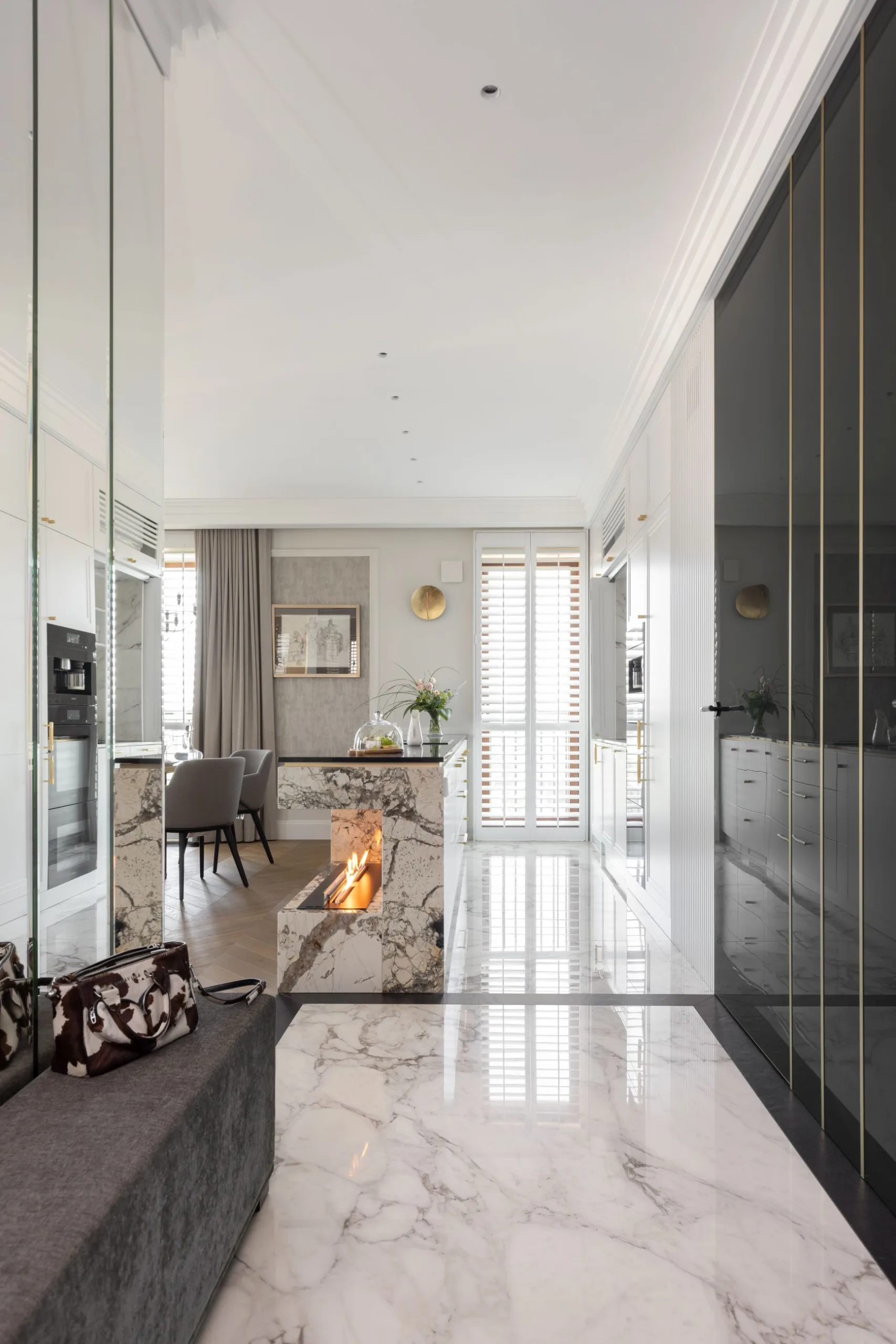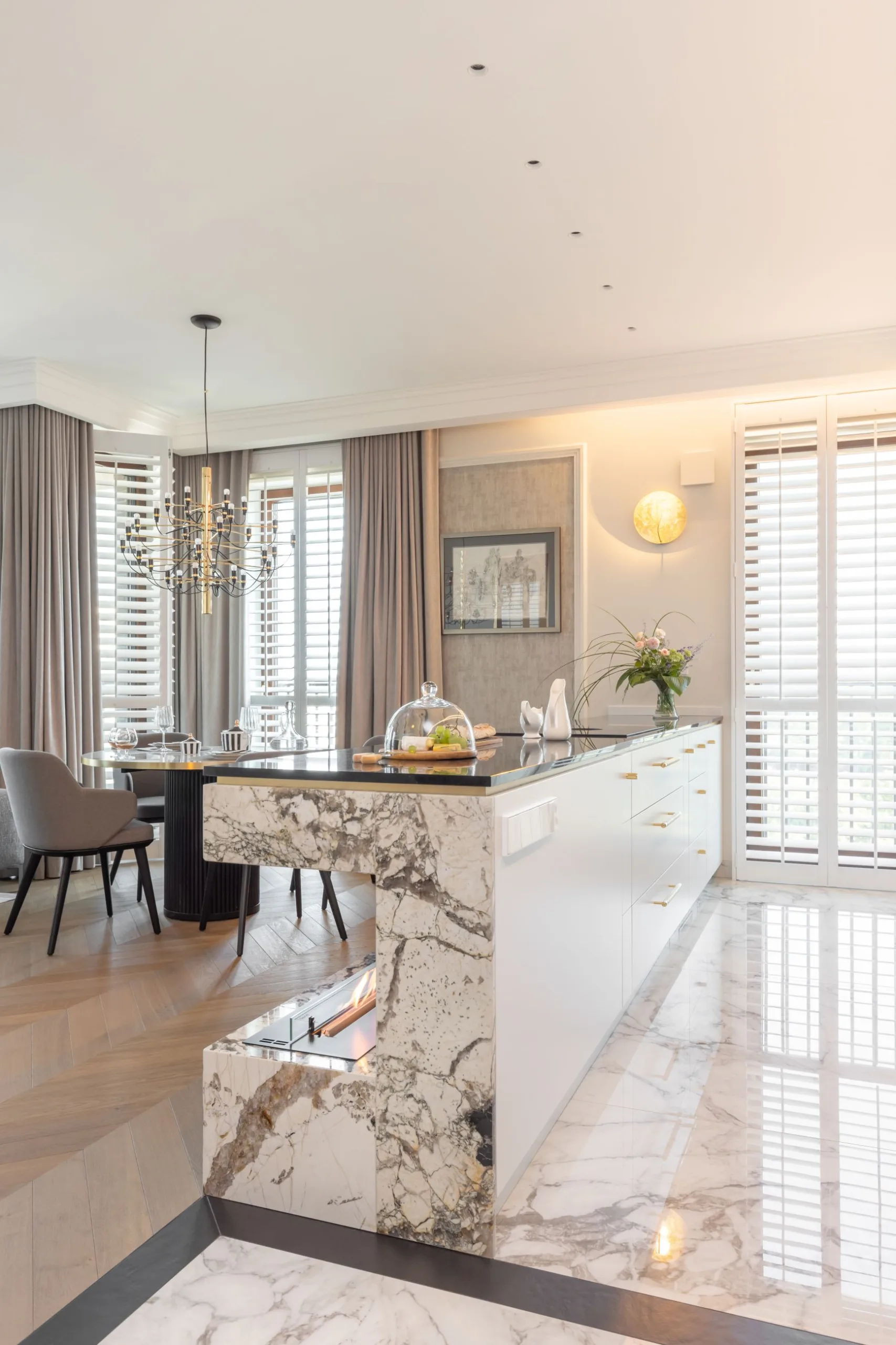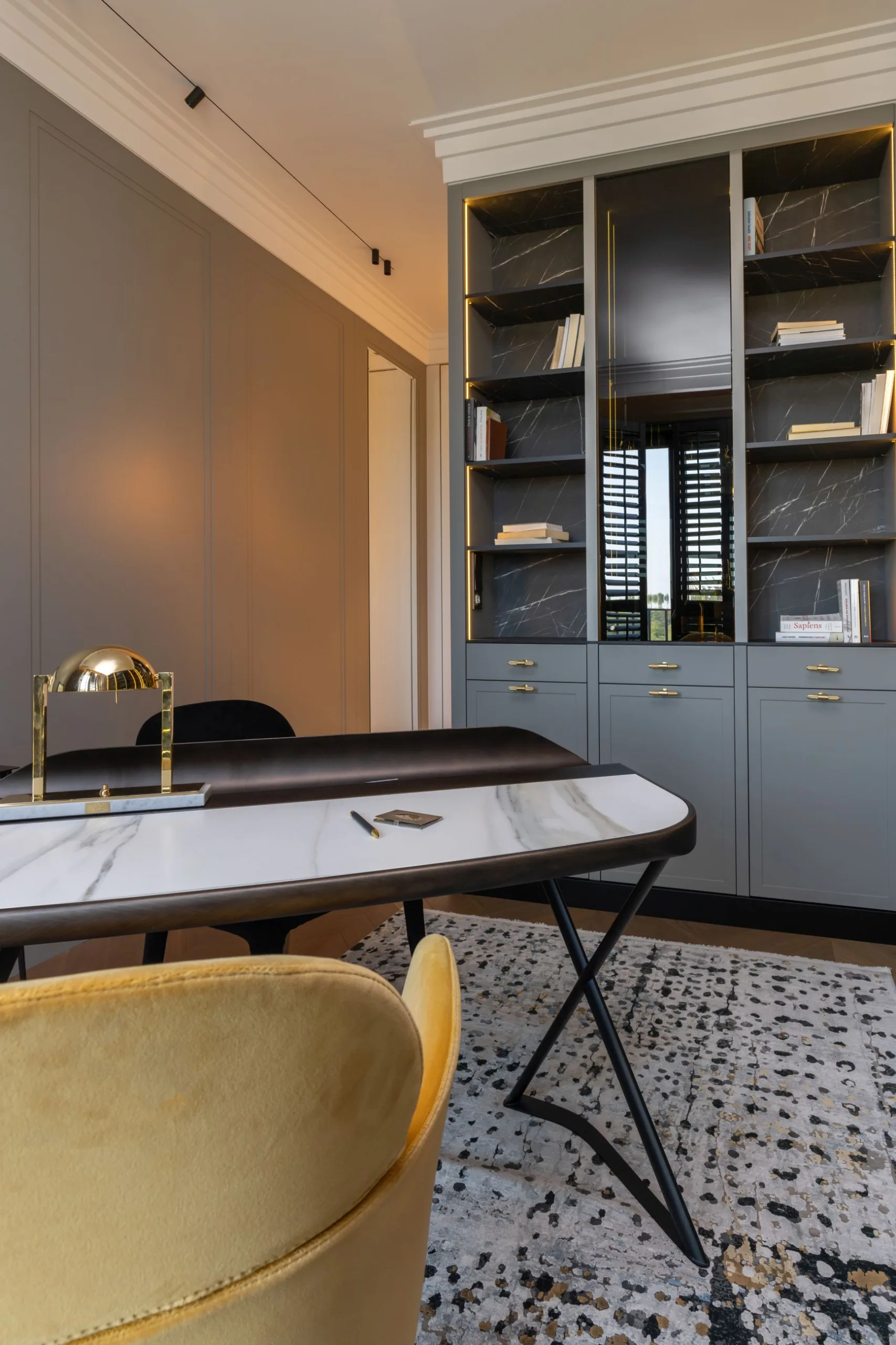 Ten apartament od pierwszego kroku komunikuje swoją tożsamość. Jest elegancki, dopracowany i spokojny, a jednocześnie wyraźnie podzielony na role, jakie ma pełnić na co dzień. To przestrzeń życia rodzinnego, ale też miejsce pracy i spotkań – zaprojektowana tak, by granice między tymi światami były czytelne, choć niewidoczne na pierwszy rzut oka.