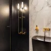 Przy umywalce znajdziemy podtynkową baterię Citterio E marki AXOR w kolorze złotym polerowanym, która w połączeniu z czarną ceramiką tworzy duet doskonały. To kolekcja idealnie pasująca do charakteru tego apartamentu, bo łącząca w swojej formie klasykę z nowoczesnością. Łagodne kreślone krawędzie wylewki zestawione zostały tu z intuicyjnym w sterowaniu, przyjemny w dotyku i płynnie działającym uchwytem typu pin. Bateria wyposażona jest w system EcoSmart zapewniający ograniczone zużycie wody. Łączy zatem wyjątkowe piękno spod ręki jednych z najlepszych współczesnych designerów: Antonio Citterio i Toana Nguyena, z zaawansowanym rozwiązaniami technologicznymi. Dopełnieniem aranżacji są akcesoria z linii AddStoris marki hansgrohe. To elementy o ponadczasowym wzornictwie, które harmonijnie wpisuje się w każdy nowoczesny projekt łazienki.