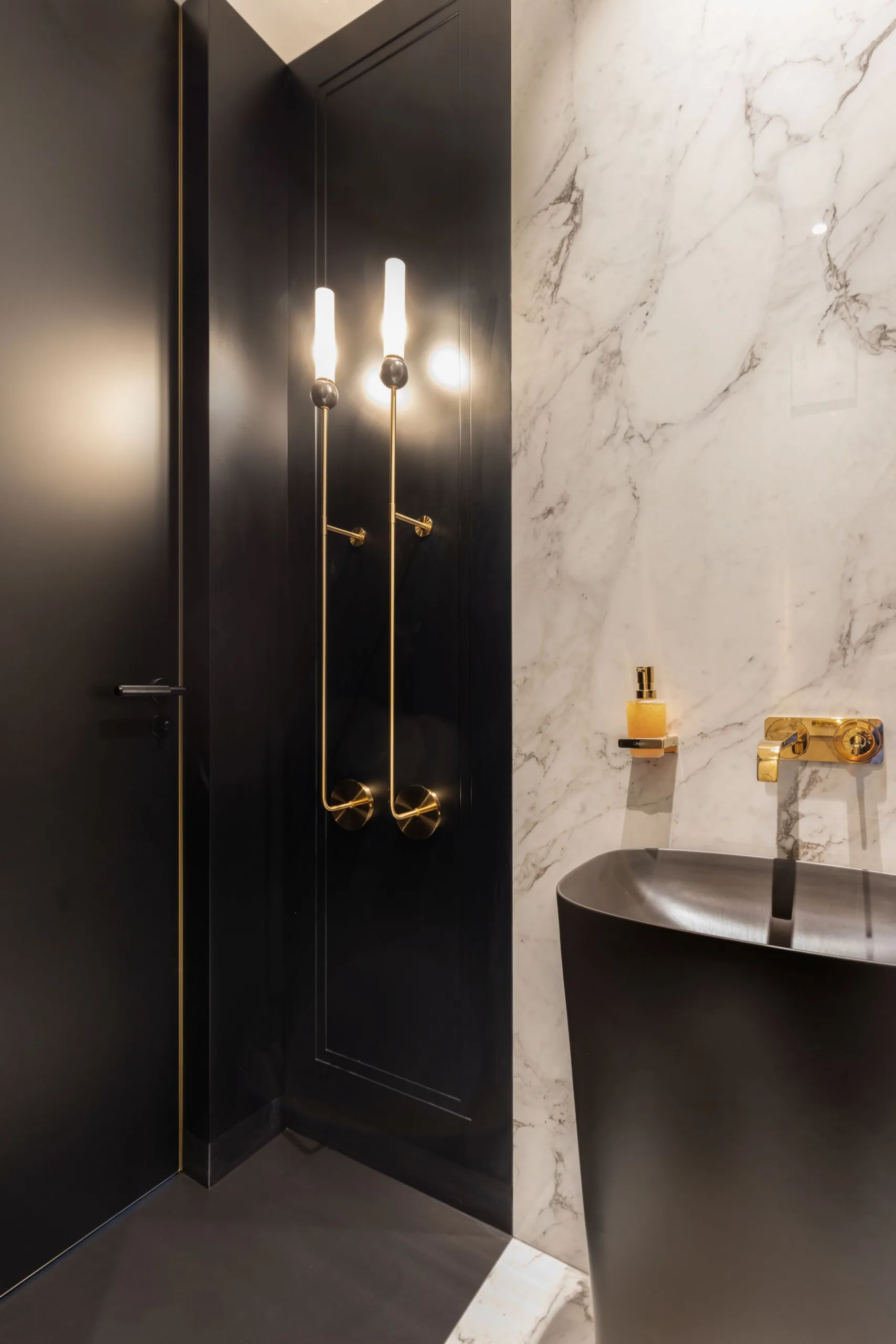 Charakter tej części domu dopełnia niewielka toaleta gościnna znajdująca się tuż przy wejściu do apartamentu, za ukrytymi w ścianie ze szkła polimerowego firmy Piu drzwiami. To dyskretnie wkomponowane wnętrze zaprojektowano z niemal teatralnym rozmachem. Czerń (także rzeźbiarskiej formy stojącej umywalki marki Catalano), złoto, nastrojowe światło i dopracowane detale tworzą przestrzeń, która robi wrażenie i pozostaje w pamięci. Lustra powiększają optycznie wnętrze, subtelne oświetlenie podkreśla faktury, a każdy element – od armatury po kinkiety – został dobrany z myślą o jakości i komforcie gości.